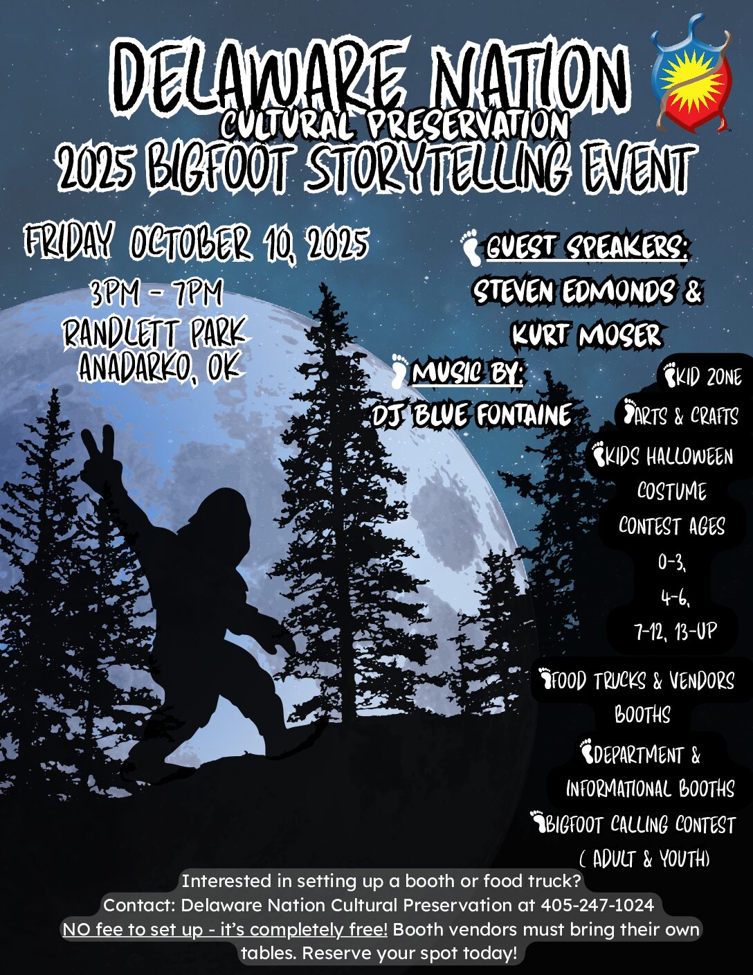 Delaware Nation 2025 Bigfoot Event Map Unavailable Date/Time Date(s) - 10/10/20253:00 pm - 7:00 pm Categories No Categories